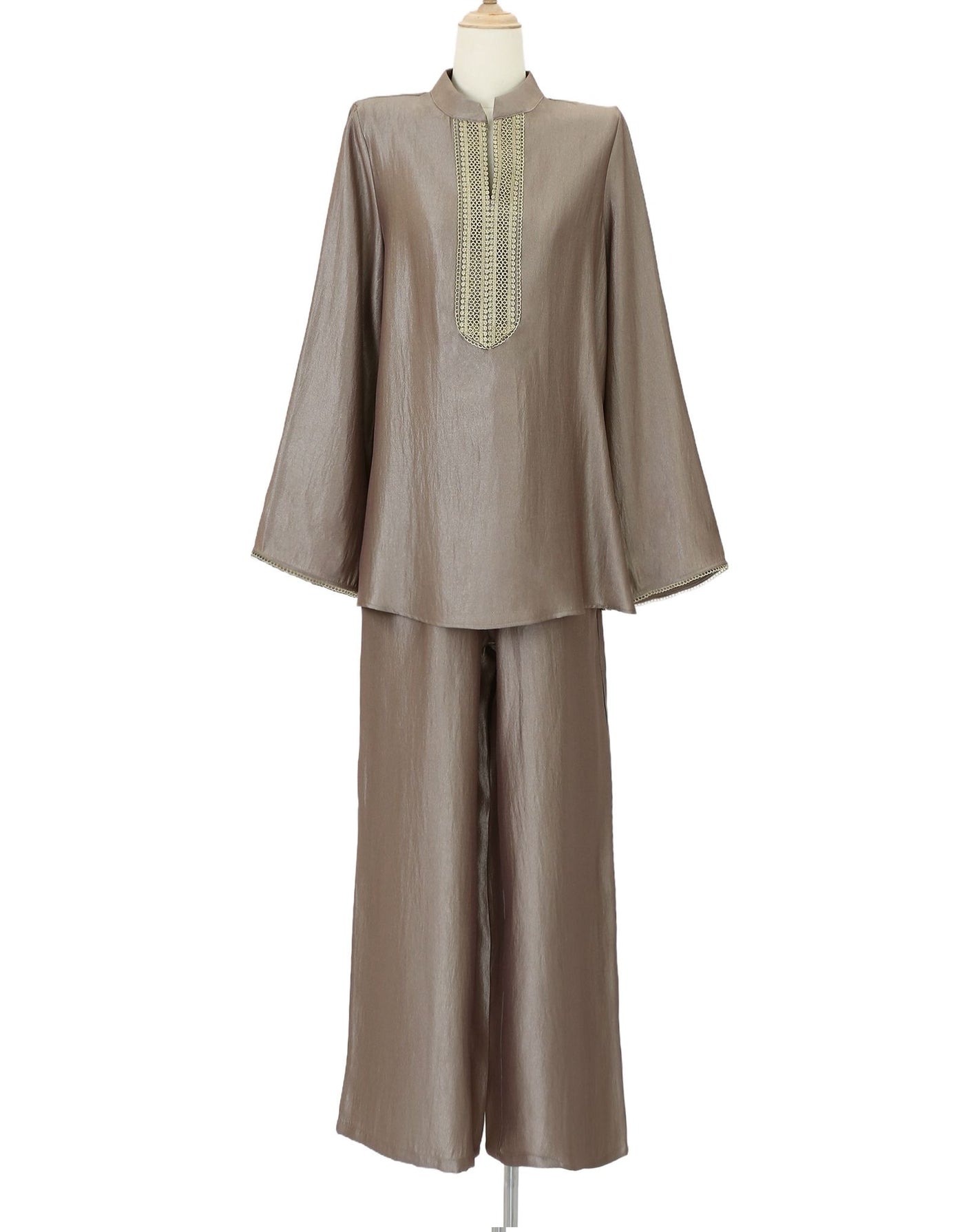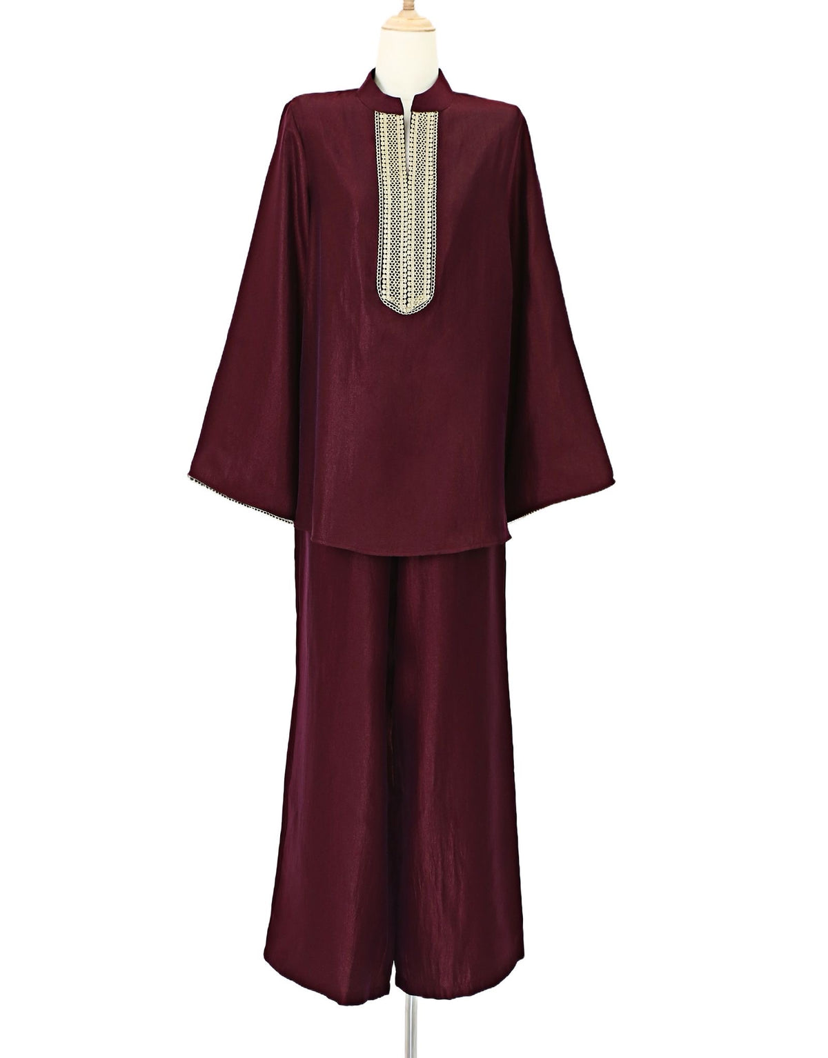 Following the success of our bestselling organza collection, this embroidered organza co-ord set introduces a refined, new-and-improved design. Crafted from lightweight organza with a soft sheen, the set offers a graceful drape and effortless comfort. The standout embroidered neckline adds texture and a luxurious finish, elevating the simplicity of the silhouette. Paired with wide-leg trousers, this two-piece creates a balanced, modest look ideal for occasions or elevated everyday wear.