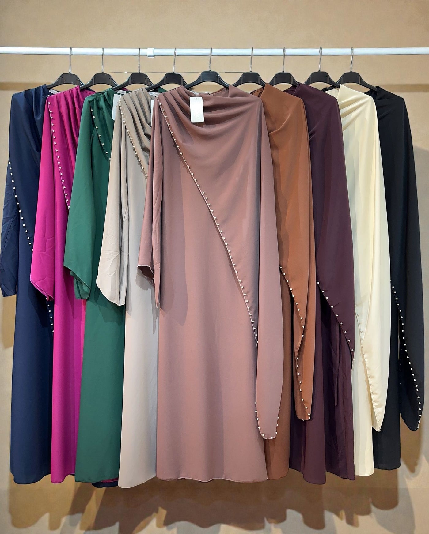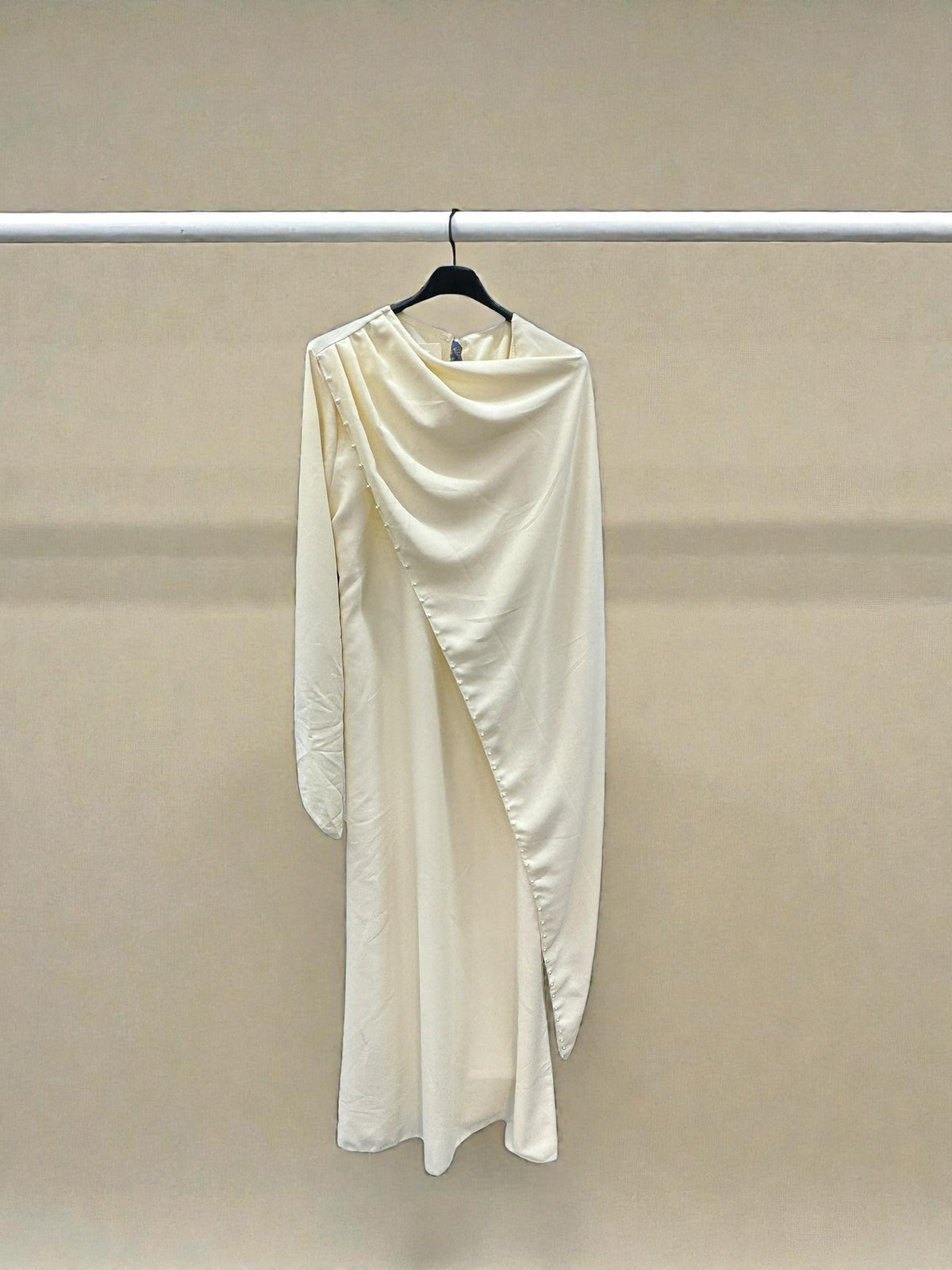 Our Pearl Layered Maxi Dress is designed to make a statement with effortless grace. Featuring a beautifully draped overlay trimmed with delicate pearls, this piece offers a unique layered silhouette that flows elegantly with every step. Perfect for evening wear, special occasions, or modest elevated styling.