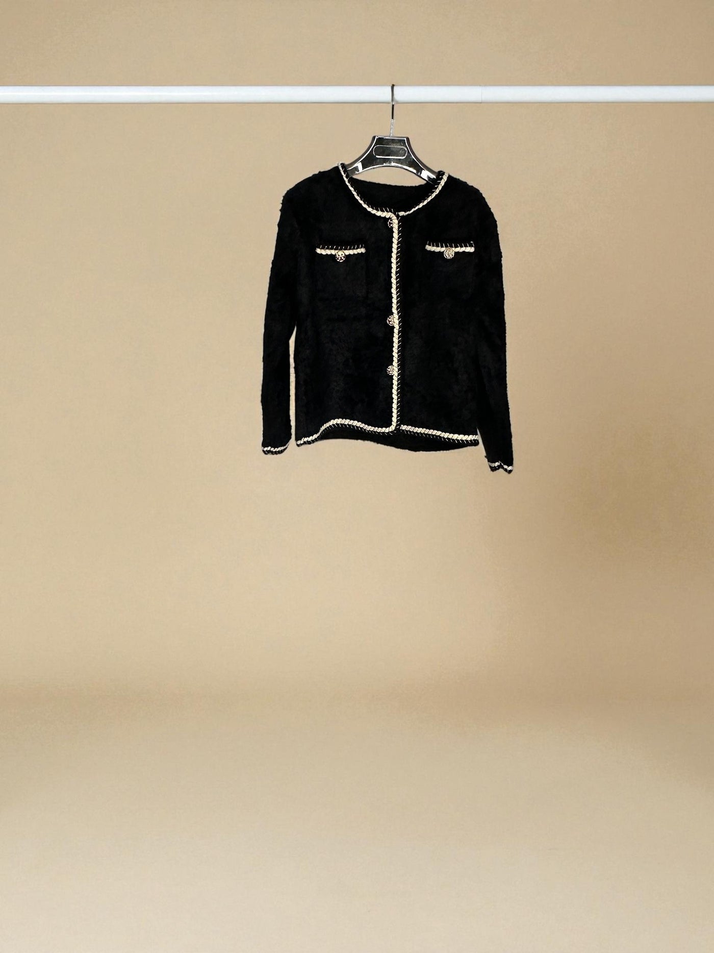 Details: Textured fur finish, contrast braid trim, and decorative gold buttons for an elegant, tailored look.