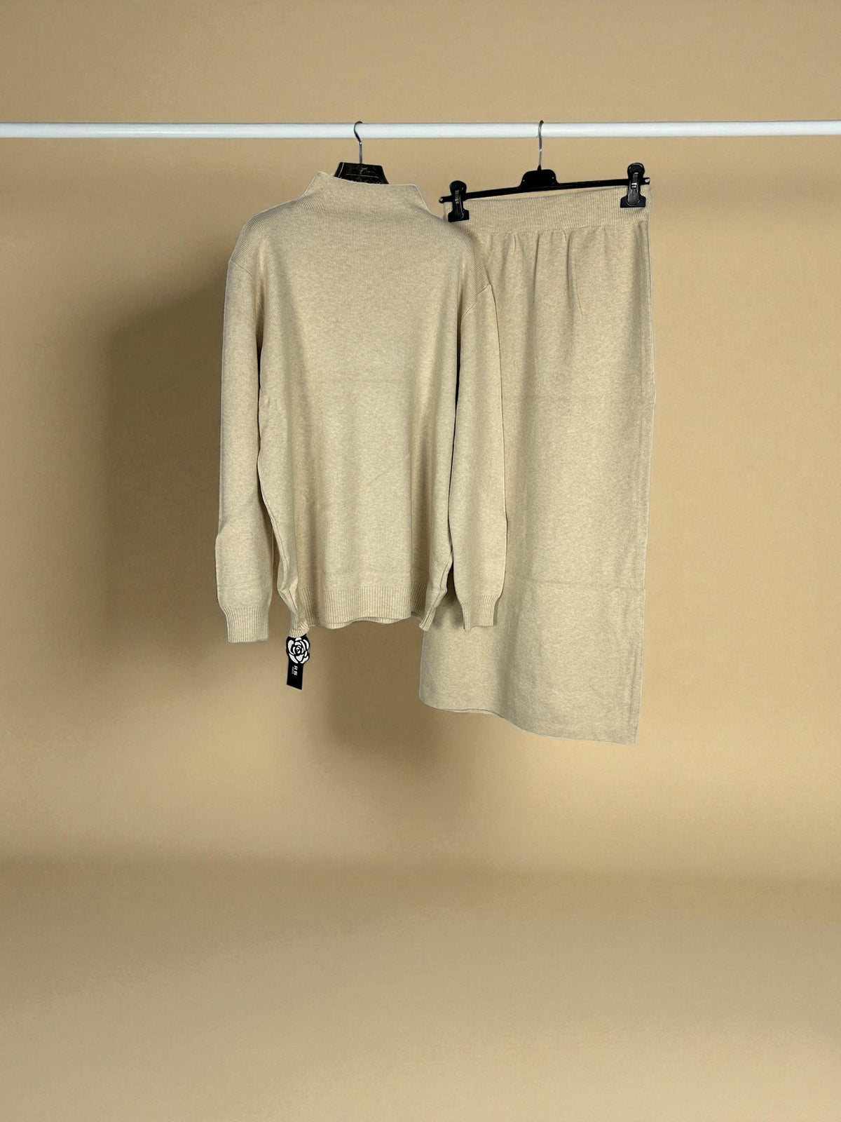 Details: High-neck top with a relaxed fit and matching long skirt with an elasticated waistband, offering both style and ease of movement.