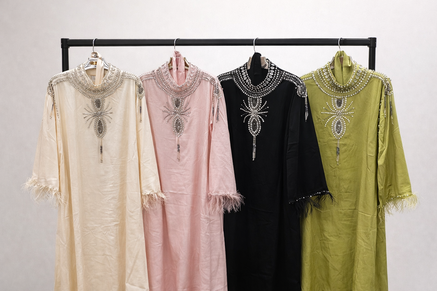 Our Imperial Crystal Collar Kaftan, a bold expression of regal elegance and refined craftsmanship.