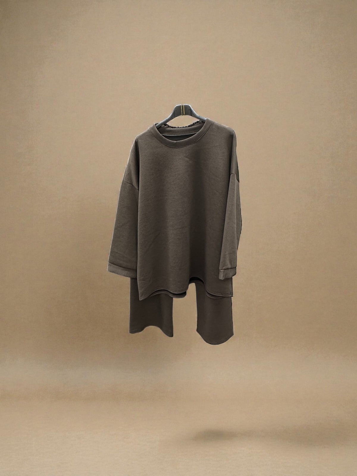 Crafted from a soft, heavyweight fabric blend, the top features a modest, loose silhouette while the matching trousers provide a comfortable fit with ease of movement. Ideal for layering or wearing as a complete set, this co-ord is perfect for casual days, travel, or relaxed outings while still looking put-together.
