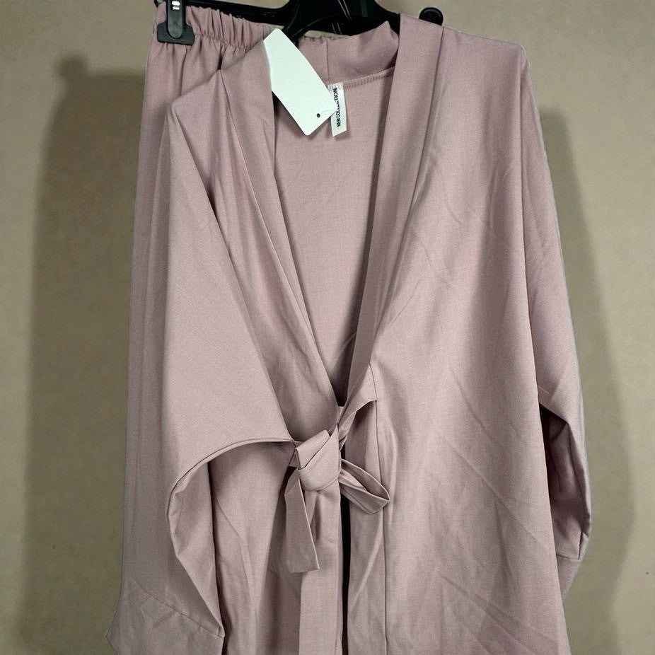 The wrap-style top creates a soft, draped finish that can be adjusted for a flattering fit, while the matching wide-leg trousers provide ease of movement and a relaxed feel. Crafted from a lightweight fabric with a smooth texture, this set is ideal for all-day wear while maintaining a polished look.